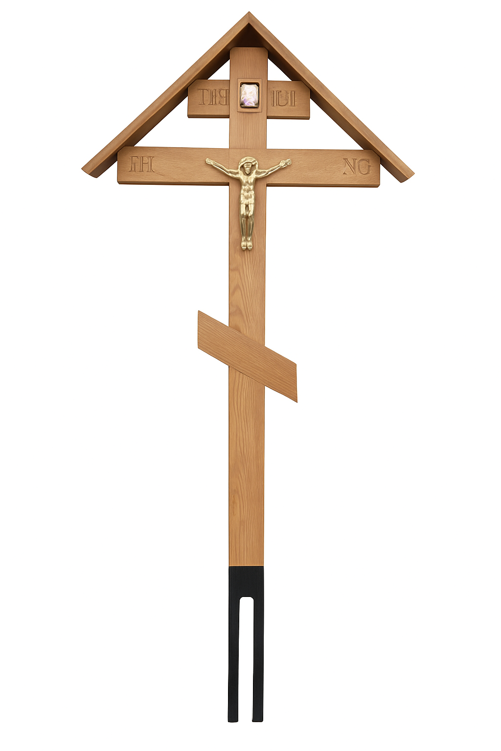 Деревянный крест с металлическим распятием и защитным козырьком. Практичное решение для длительной установки.